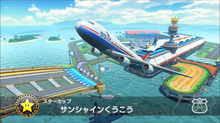 マリオカート8で初登場したコース「サンシャインくうこう」はその名の通りシャインが描かれた大きな空港が舞台となっている
