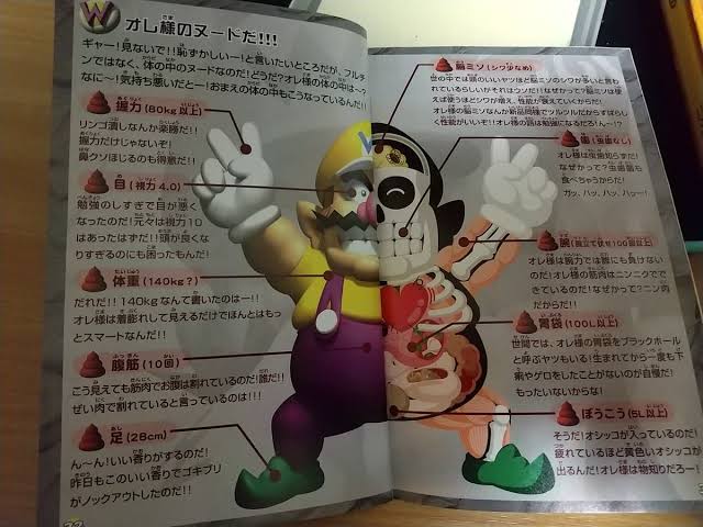 ゲームキューブ用ソフト「ワリオワールド」の説明書にはオレ様のヌード(体内図)が描かれたコーナーが存在する
